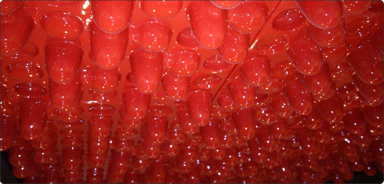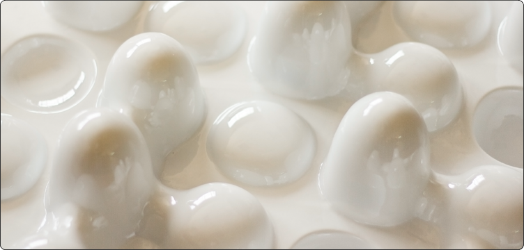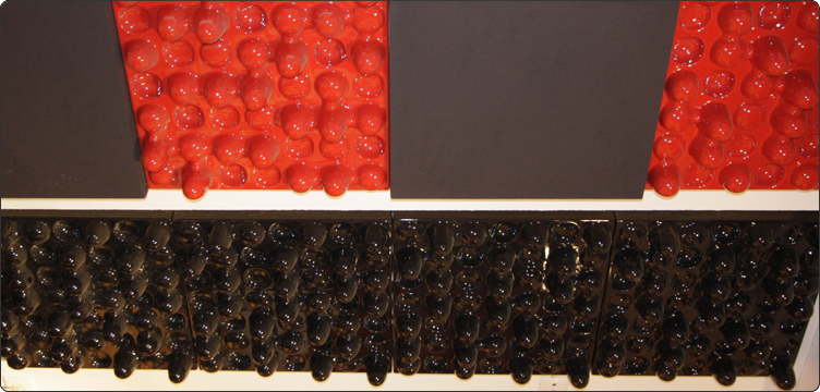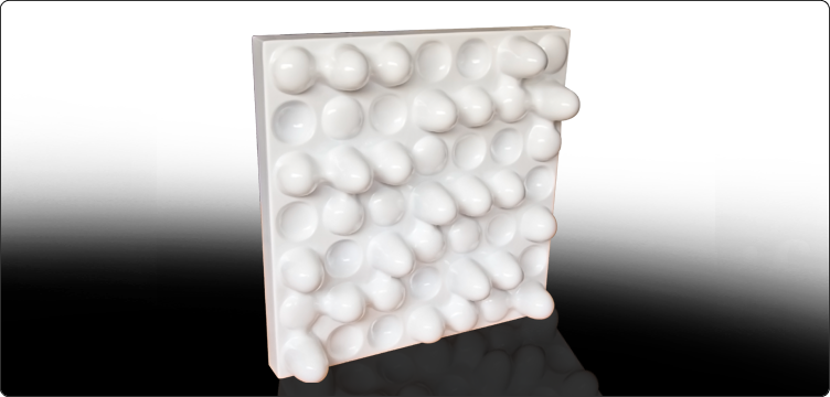 Les formes sont principalement convexe, mais il y a aussi des formes concaves qui ne répètent jamais. Sur la face plane d'absorption, 3 différentes matières premières recyclées à 100% ont été utilisées.